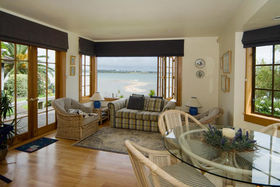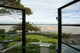 out to the 'Summer House' with expansive lawn and beachside patio beyond. With five