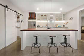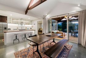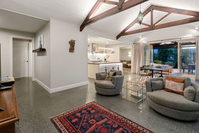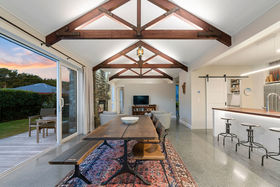 This home was extremely well-built on a sunny corner site 3.5 years ago by the owner, a respected local builder. Clever design references a sophisticated take on rustic farm buildings. The beautiful kitchen/family area spreads across polished concrete floors and features a dramatic barn-style ceiling with exposed trusses.